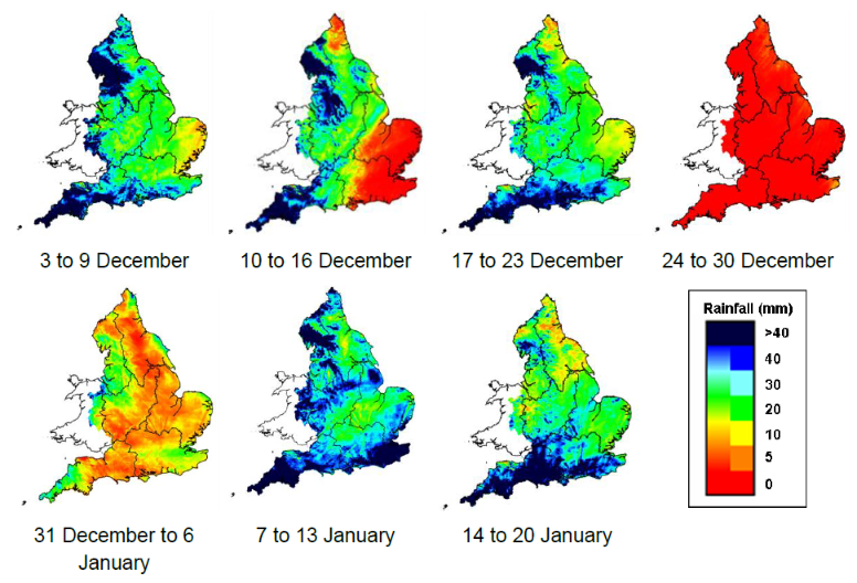 Here’s some information from the Environment Agency’s rainfall and river flow summary for the week ending January 20th. First of all here are the rainfall maps for England as a whole: