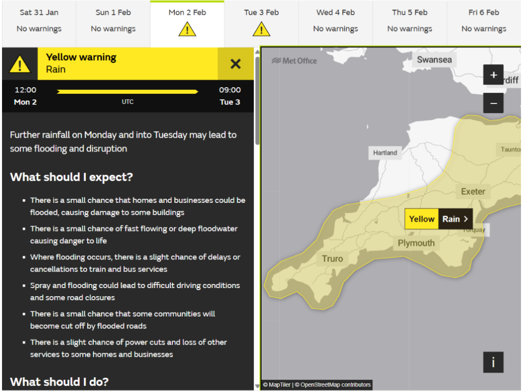 As you can see, water levels are significantly below those in the drought year of 2022 at the moment. However, perhaps help is at hand from the weather gods? Here is the current set of Met Office weather warnings for West Devon:
